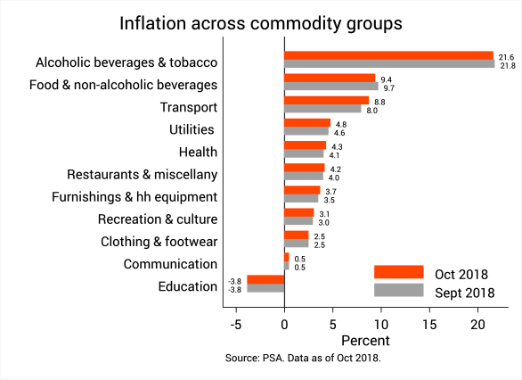 Bagamat bumaba nang bahagya mula 21.8% tungong 21.6%, pinakamataas pa rin ang inflation sa alak at tabako. Sinisisi ito sa mas mataas na buwis sa ilalim ng TRAIN Law.